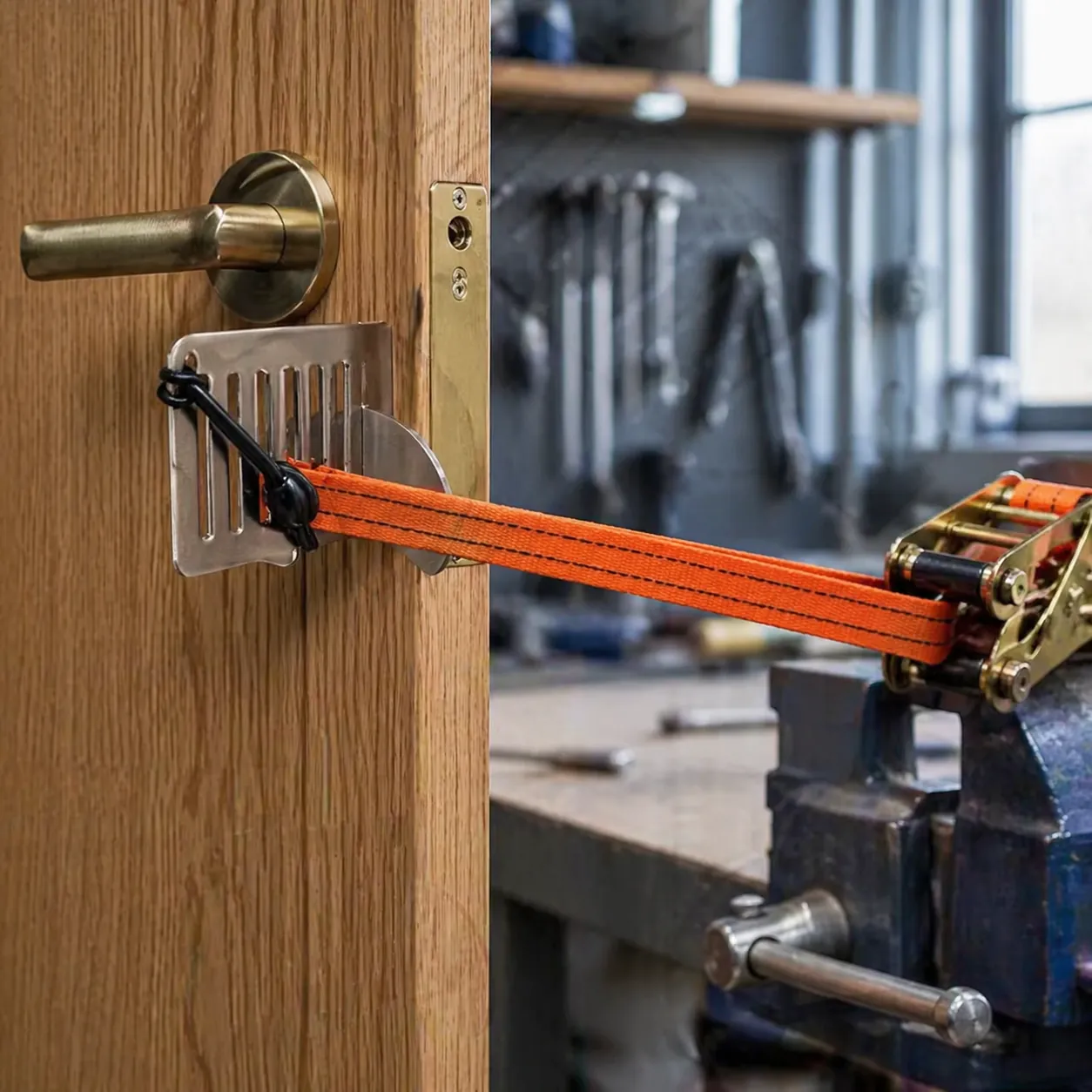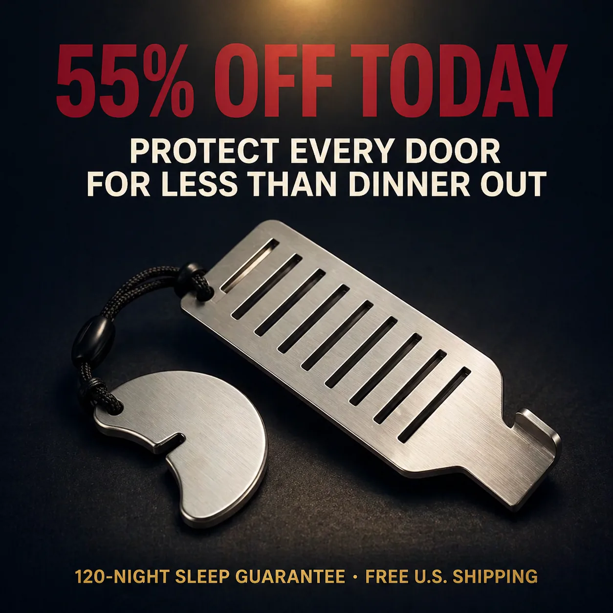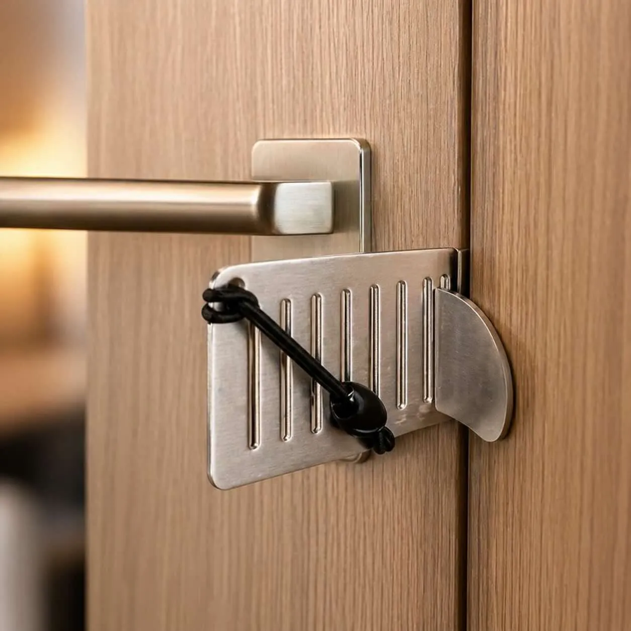 We specifically chose solid stainless steel based on retired-locksmith feedback. Plastic portable locks crack under pressure, warp with temperature, and rarely hold up to real force. Stainless steel catches the door and stays put, quietly, for years.